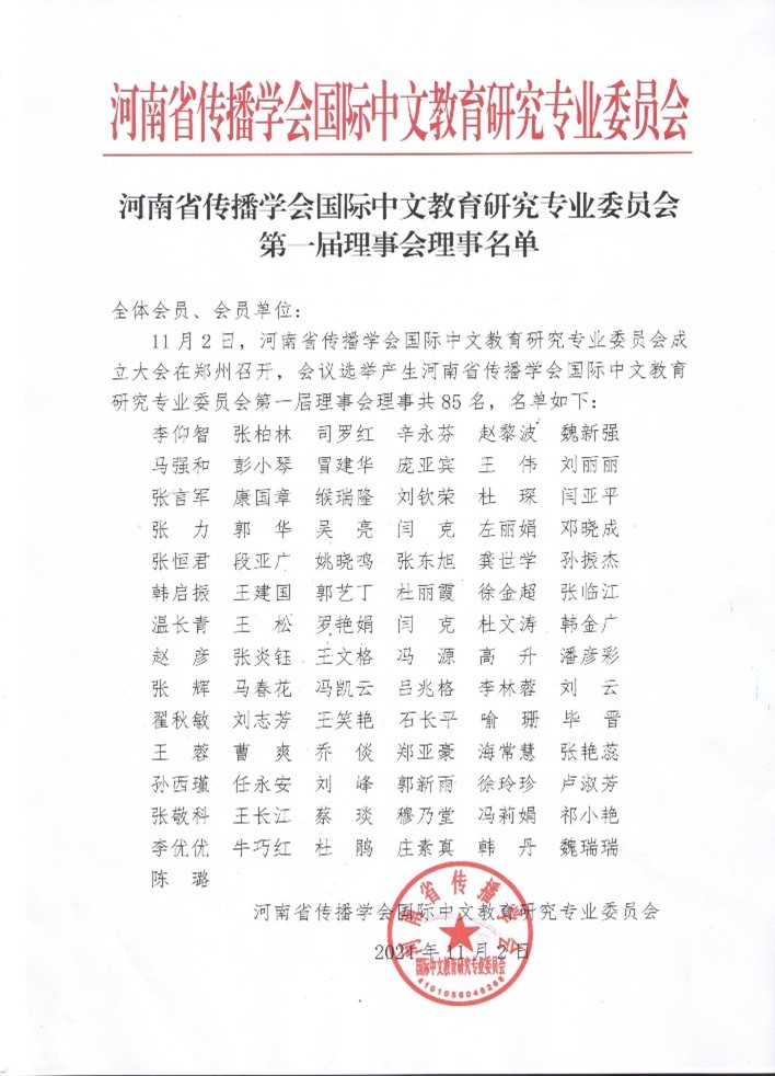大会选举郑州师范学院党委书记李仰智为河南省传播学会国际中文教育研究专业委员会第一届理事会会长,郑州大学学报副主编司罗红教授、河南大学文学院辛永芬教授、河南师范大学文学院院长赵黎波教授、华北水利水电大学国际合作交流处处长魏新强教授、郑州师范学院文学院院长刘钦荣教授等任副会长,郑州师范学院文学院副院长牛巧红博士任秘书长。
