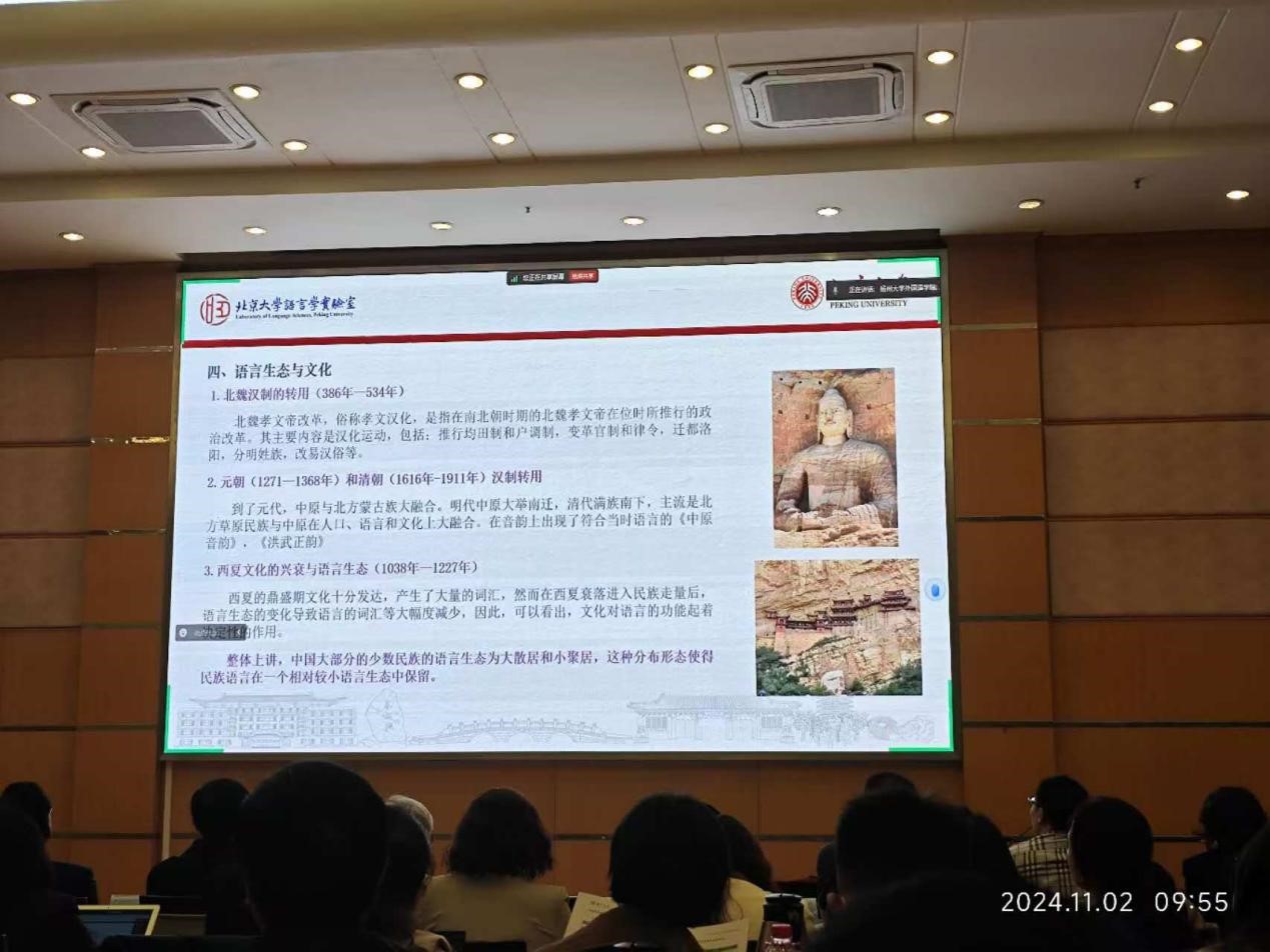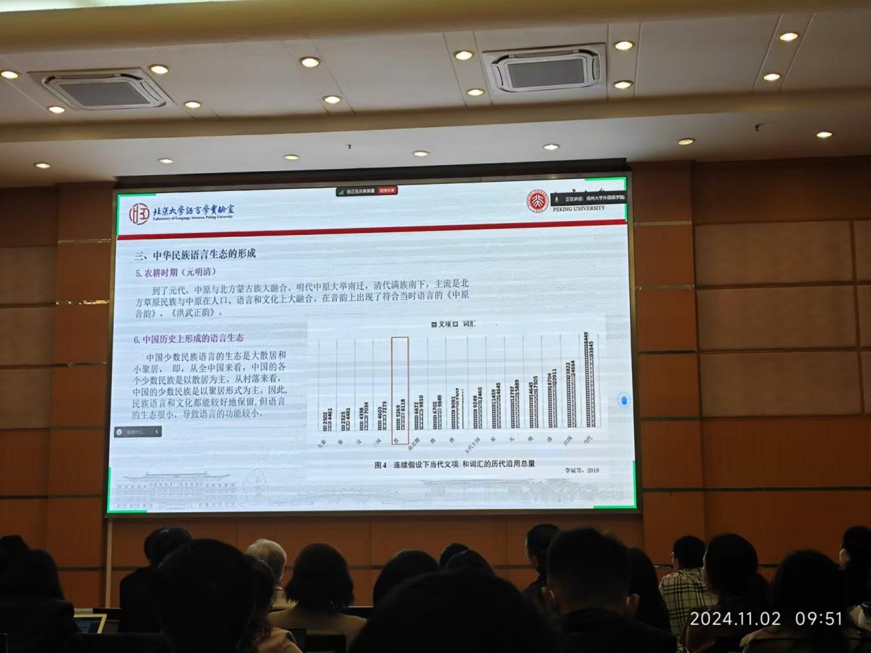此次会议首先由扬州大学校领导、教育部语言文字研究所刘朋建所长致辞,教育部语言文字信息管理司有关负责同志讲话,点明本届会议聚焦当前国内外的国家语言战略与规划的新理念,新概念,新突破,具有重要的学术价值。会议议题包括但不限于:新时代语言政策与规划研究、数智时代语言文字应用研究的新任务、中文国际化背景下的国际中文教育研究、国家通用语言文字教育教学、能力评估研究中华民族共同体视角下的语言文字接触交融研究、语用研究等。会上,教育部“长江学者”特聘教授、国家语委语言能力高等研究院院长杨亦鸣教授从国家创新驱动发展战略与文科实验室新赛道角度做了语言学类文科实验室建设背景、任务、路径和难点的主旨报告。孔江平教授从人类起源角度经过研究发现语言的生态决定了语言的使用功能、性质和范围。周作明教授从文化、民族、话语体系、人民美好生活等方面试论筑牢中华民族共同体意识的语言服务。姚喜双教授以邯郸打造成语文化智慧之都的实践案例,提出要充分发挥成语文化功能,为经济社会发展服务。几位专家的报告内容充实、形式多样,专题报告后各位专家与参会人员进行了亲切交流。
