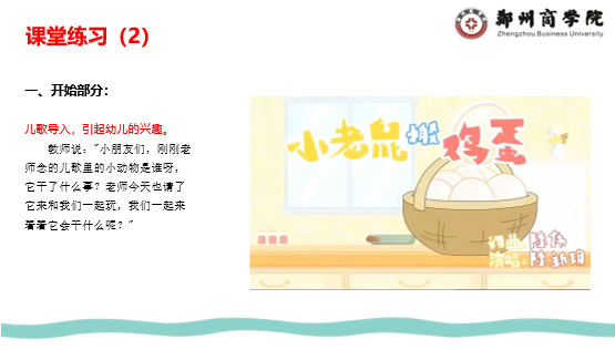 课程开始阶段,杜老师在进入“幼儿园讲述活动”设计之前,明确了“目标”设置的具体要求,带领学生进行“讲述活动”的有关知识的贯通,学生们对“目标”设定进行分析与思考,她通过如何促使幼儿认识讲述对象?如何在讲述活动中使幼儿做到独立构思?如何帮助幼儿寻找到合适的讲述凭借物?杜老师层层深入的“主导性”课程设计,使学生打开了解决问题的多维思考空间。启发式教学与案例分析相结合,使学生理解并牢固掌握了“目标”设定的具体方法。