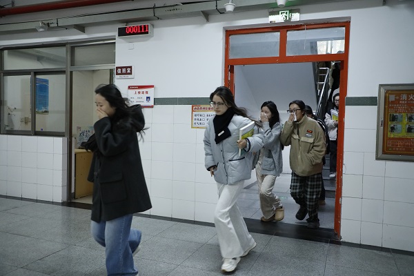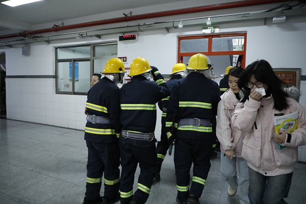 首先保卫处老师在宿舍三楼开启发烟罐。待烟雾全然升起时,由宿管员拨打报警电话,救援车到达后,同学们在辅导员老师的指挥下,靠右顺墙边用湿毛巾捂住口鼻,弯腰低姿,紧张有序地从步行梯下楼进行有序疏散。
