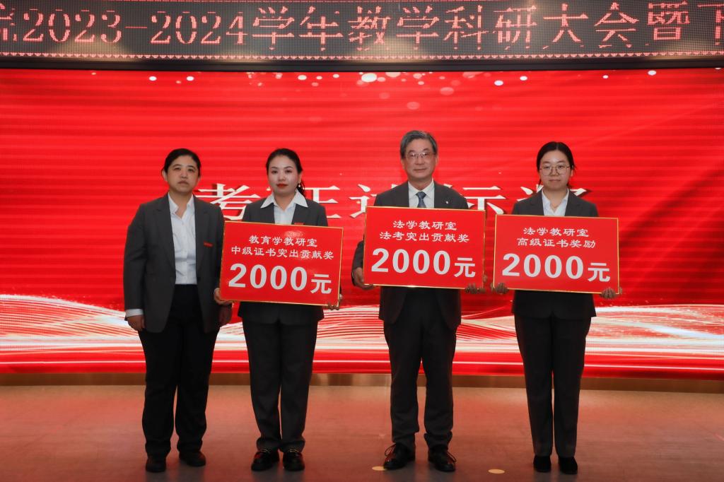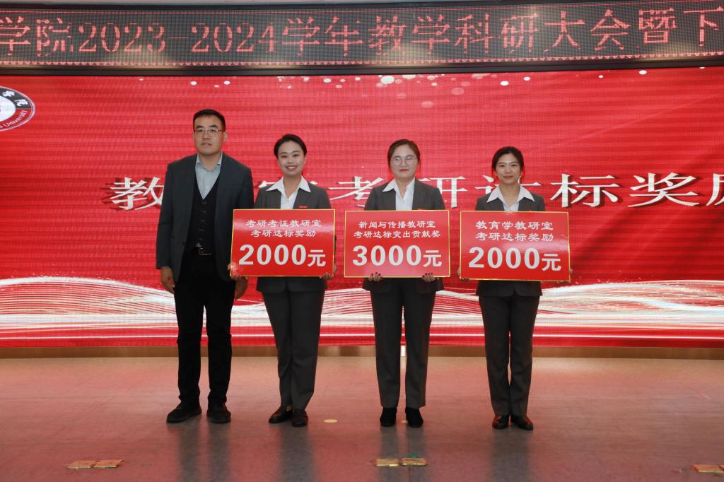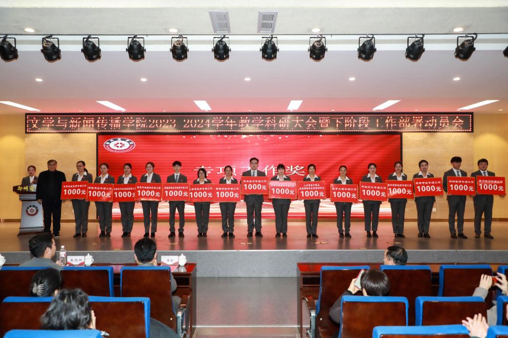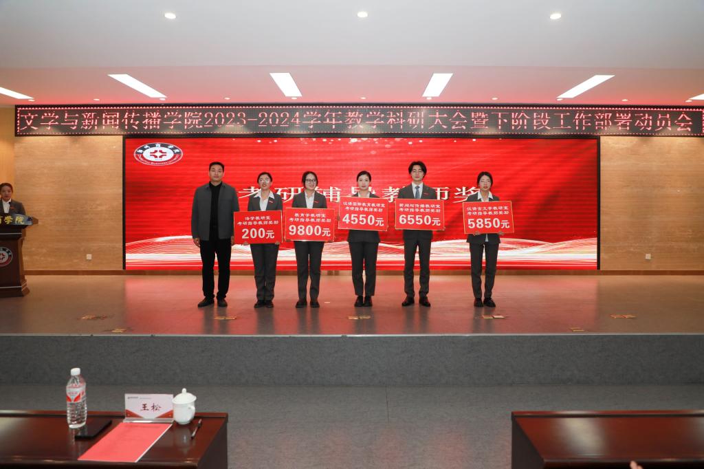 会议上宣读了《文学与新闻传播学院2024届毕业生考研考证奖励方案》,该方案旨在激励广大毕业生积极备考,提升考研考证的通过率,为学院的学术氛围和人才培养贡献力量。与会领导分别为在教学工作中取得优秀成绩的教研室和教师、辅导员颁奖。