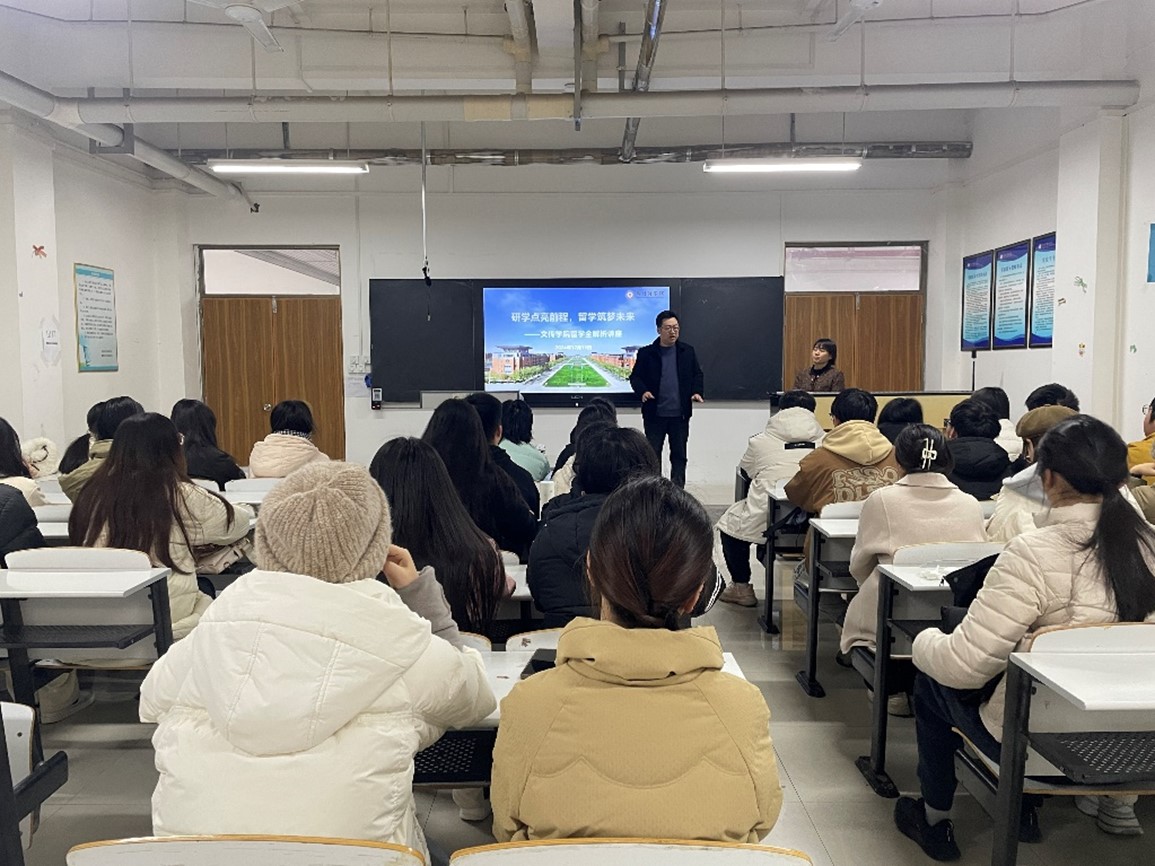 12月11日,文学与新闻传播学院联合国际交流处成功举办了 “研学点亮前程,留学筑梦未来——文传学院留学全解析”的专题讲座。此次讲座旨在为有留学意向的学生提供全方位的信息支持,帮助他们更好地规划未来的学业和职业发展。国际交流处赵彦丽处长、熊雅洁老师,新西兰怀卡托大学中国教学中心中国区负责人朱姝颖,我院王松院长出席讲座。