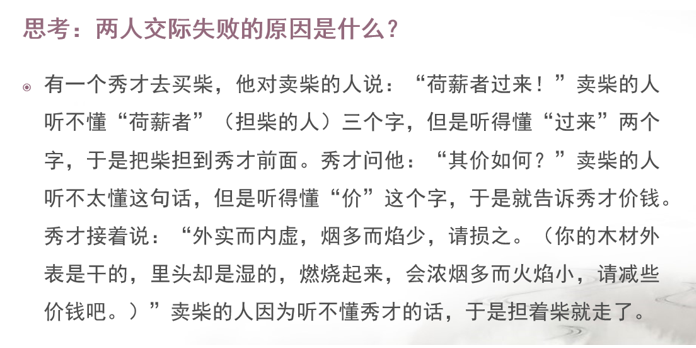 在导入环节,刘露老师采用“秀才买柴”的故事进行导入。这一富有生活气息的故事,瞬间抓住了学生的注意力。通过秀才因咬文嚼字而导致买柴失败的情节,引发学生对于口语表达准确性和通俗性的思考,让学生在轻松愉悦的氛围中开启了对口语表达这一主题的探索之旅。这种趣味导入的方式,不仅巧妙地引出了课程内容,更激发了学生的学习兴趣和好奇心,为整堂课奠定了良好的学习基调。