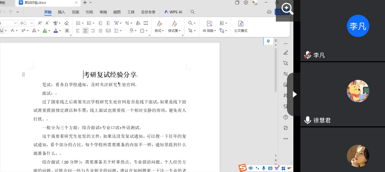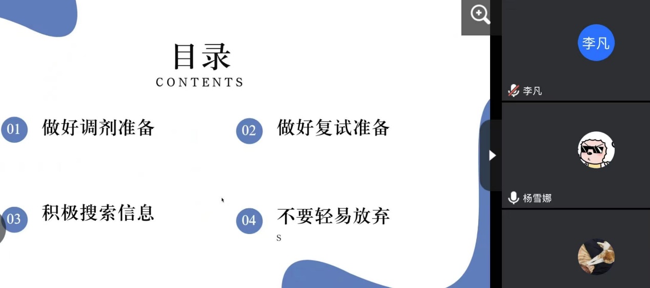 通过举办考研经验交流会、开设考研自习室、提供专业辅导等方式,为考研学子提供全方位的支持和帮助。本次线上考研复试经验交流会的成功举办,不仅为考研学子搭建了交流学习的平台,也体现了学院对学生的关心和关怀,助力学子们在考研路上乘风破浪,成功“上岸”。