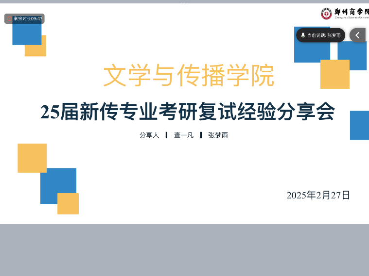 为了帮助25届考研学子更好地应对复试和调剂,提前做好规划,2月27日,我院新闻与传播教研室举办了线上考研复试及调剂经验分享会。此次分享会邀请了24届成功上岸的学姐查一凡和张梦雨作为分享嘉宾,分别从复试准备和调剂经验两个方面进行了详细讲解,为同学们提供了宝贵的经验和建议,25届所有过线学生全部参会。