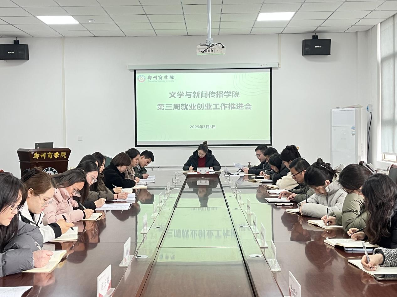文传学院于2025年3月4日在自力楼216会议室召开第三周就业创业工作推进会,学院党委书记贾蓓、团委书记王凯及全体辅导员参加会议。