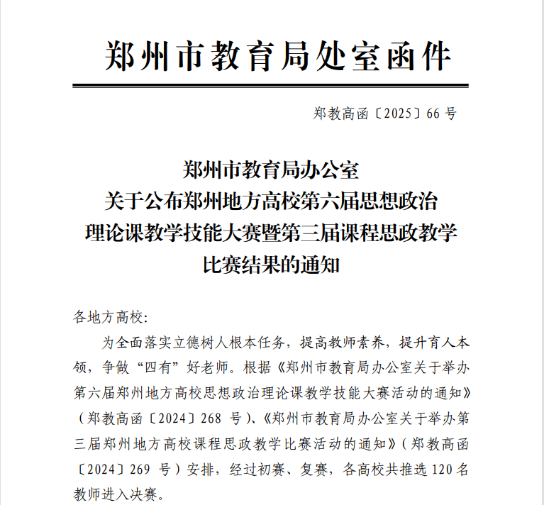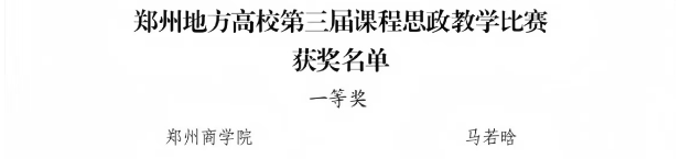 近日,郑州市教育局发布《关于公布郑州地方高校第六届思想政治理论课教学技能大赛暨第三届课程思政教学比赛结果的通知》(郑教高函〔2025〕66号),我院马若晗老师荣获一等奖。