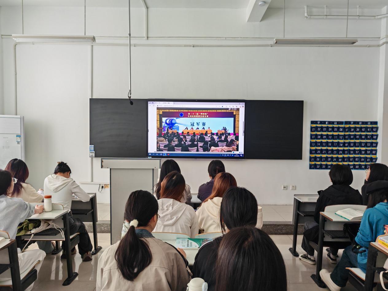 4月25日,为激发知识产权专业学生对学科竞赛的热情,提升专业素养,文学与新闻传播学院法学教研室的老师组织22产权专业全体学生观看了第二十二届“理律杯”决赛视频。这场别开生面的观赛活动,为同学们打开了一扇深入了解法学领域学术与实践前沿的窗口。