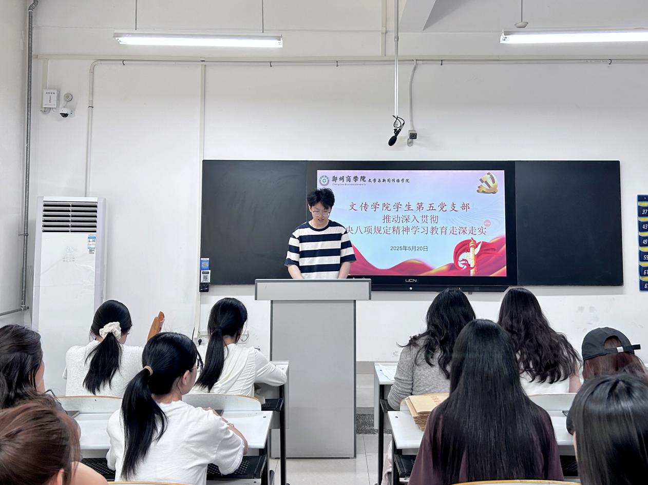 为深入学习贯彻习近平总书记关于中央八项规定的重要讲话精神,深化支部成员对中央八项规定精神的理解,增强纪律意识与责任担当,文传学院学生第五党支部于5月20日在自力楼204教室召开“推动深入贯彻中央八项规定精神学习教育走深走实”主题理论学习会。