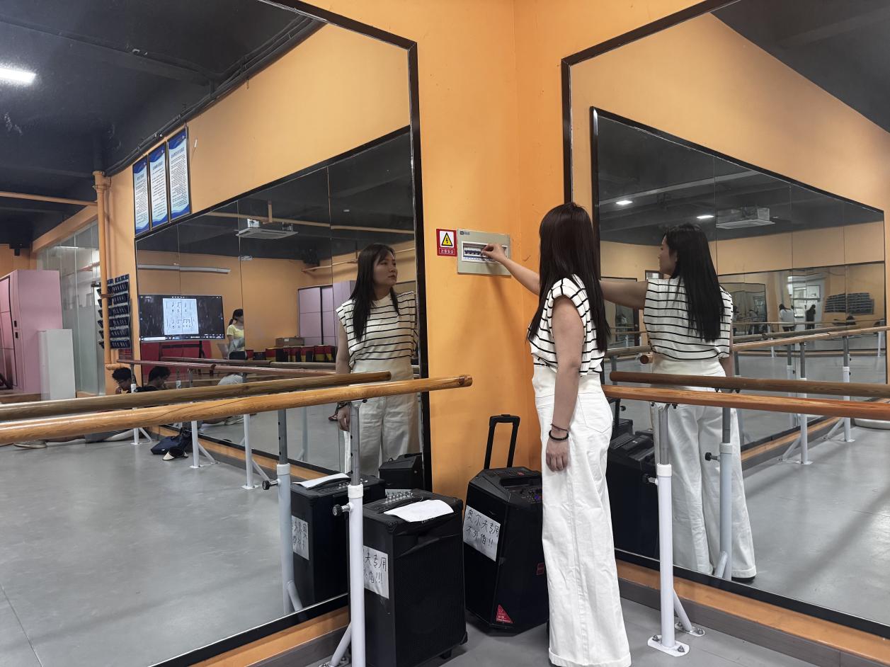 文传学院教育与新媒体实验中心教师检查奥尔夫教室用电安全