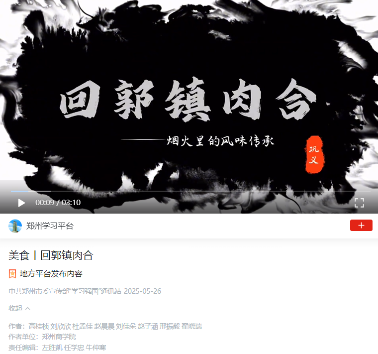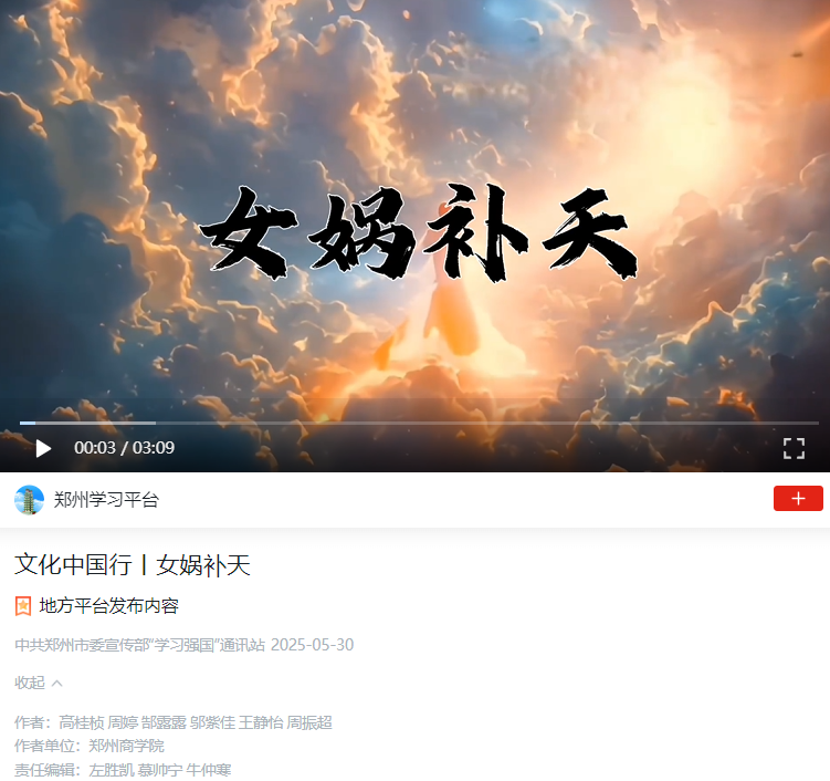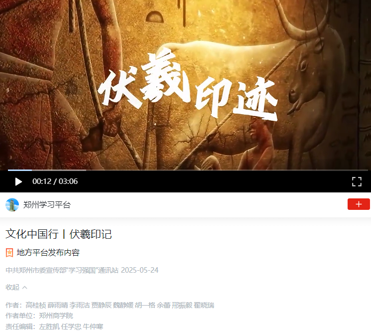 学生团队在高桂桢、翟晓瑞、许明月、邢振毅老师的带领下,利用AI技术开展文献研究,深入实地考察调研,充分挖掘河南地方非物质文化遗产资源,通过活化创新,将传统技艺、民俗活动、表演艺术等文化元素巧妙地融入现代创意,形成的独特文化艺术表达成果。并紧扣“中原文化”并以短视频的艺术表现形式呈现研究成果,最终创作出《伏羲印记》、《女娲补天》、《河图洛书》(三集)、《洛神传说》、《巩义泥塑》、《巩义白瓷》、《回郭镇肉合》等13个系列作品。