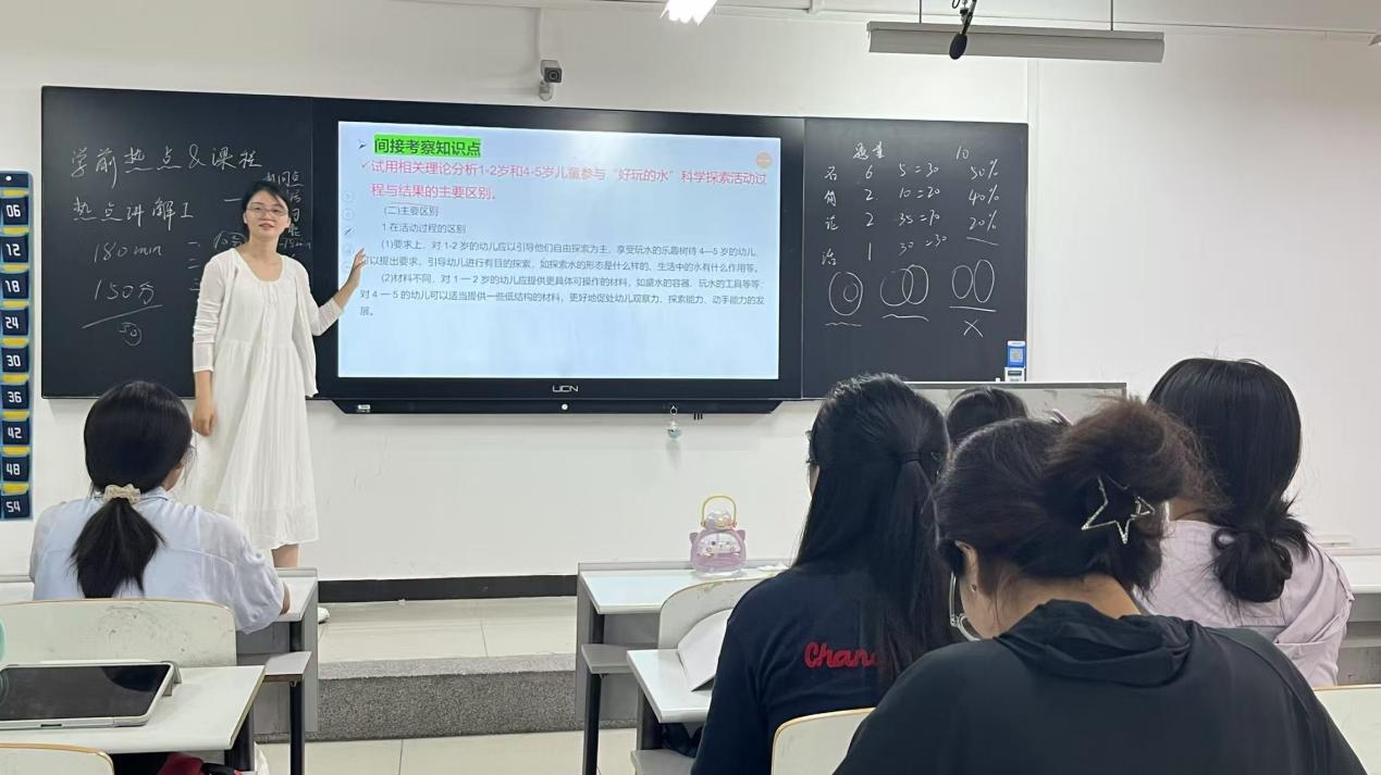 学前教育专业的王晴老师带来了两门干货满满的课程。在学前教育热点解析课程中,她聚焦前沿政策新规,探讨新兴元素融入学前教育的实践案例与发展趋势,解读热点模块,让学生把握行业动态。而在幼儿园课程专题课程里,她先梳理坚实的理论基础,再讲解主题课程、领域课程设计逻辑,深入分析课程实施要点,有效提升学生分析与解答问题的能力,为学生未来从事学前教育工作或深造奠定坚实基础。