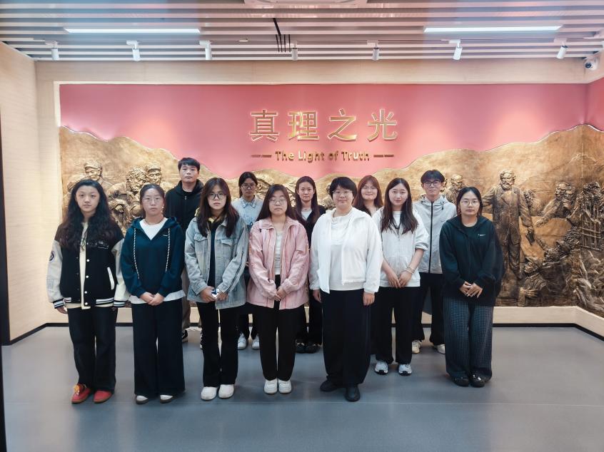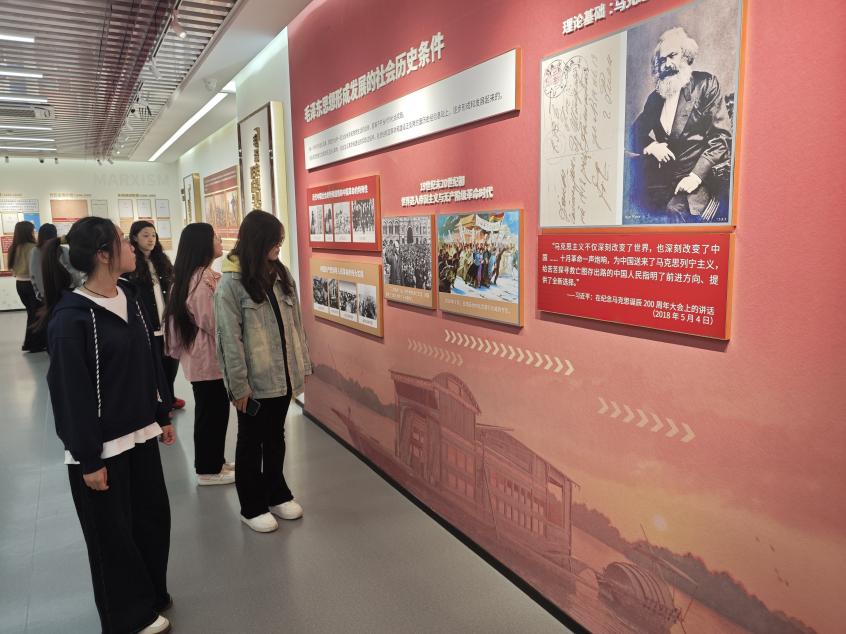 活动开始,学生第七党支部党员和入党积极分子参观“真理之光”红色影院展区。展区以马克思主义中国化时代化历史演变为核心,通过图文展板呈现不同时期理论成果与实践历程,清晰勾勒真理扎根中国的轨迹,为后续学习筑牢理论根基。