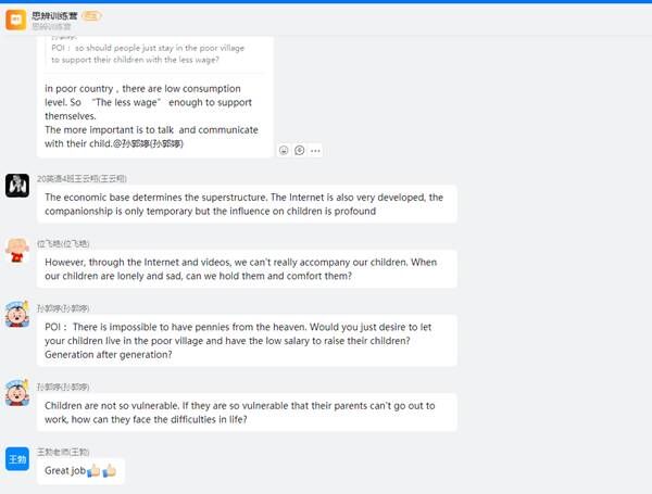 此次活动共吸引全校351名同学参与,由外国语学院思辨训练营指导老师王勃、韩笑、徐浩、韩浩和郭彪以线上授课的方式进行。几位教师以培养学生思辨意识,提高学生语言表达能力为导向,从不同议题出发,指导学生进行“如何分析辩题”、“如何立论”、“如何驳论”, “如何避开逻辑谬误”的训练;其次针对BP辩论赛中如何进行“拓展辩论”、“比较分析”和“总结陈词”三大板块进行了详细讲解,着重训练学生的论点拓展和比较分析能力;最后,为了考查学生的学习效果,激发同学们的参赛热情,指导老师通过钉钉和腾讯会议的方式线上组织了四组BP模拟辩论赛,并对同学们在比赛中暴露出的观点组织、语言能力,团队配合,时间把控等问题一一反馈,学生通过实践活动将理论化于实践,提升了听说技能,锻炼了思辨意识。