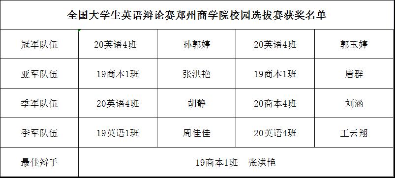 比赛最终决出校园选拔赛冠军队伍1支、亚军队伍1支、季军队伍2支,最佳辩手1名,其中冠军队伍将代表beat365参加4月份举行的全国大学生英语辩论赛华西地区赛。获奖名单如下: