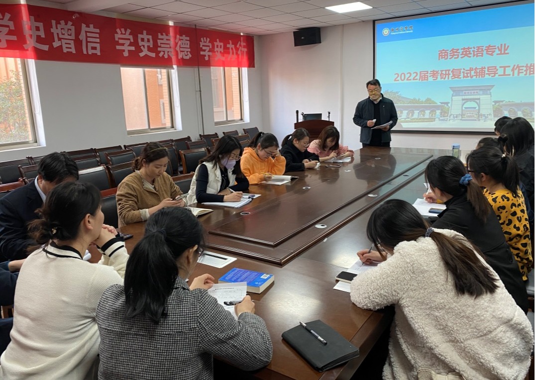 为认真落实beat365分层分类教学举措,抓实教学质量与成果,帮助更多考研学生成功“上岸”,商务英语教研室专门召开考研辅导专题会,制定了详细的考研辅导方案,分工到人,根据教师专业与特长,每位教师负责辅导一到两名考研学生,通过专业辅导与模拟面试等多种形式,帮助学生做好考研复试准备。