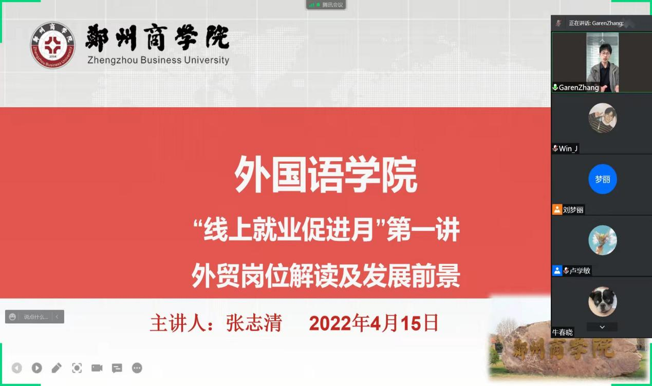 为落实外国语学院“三连贯一融合”应用型人才培养理念,持续推进专业与行业发展相结合,加强学生对外贸行业与岗位需求的认识,提升学生专业认同感与职业规划能力,外国语学院于04月15日为在校生举办线上就业宣讲活动。
