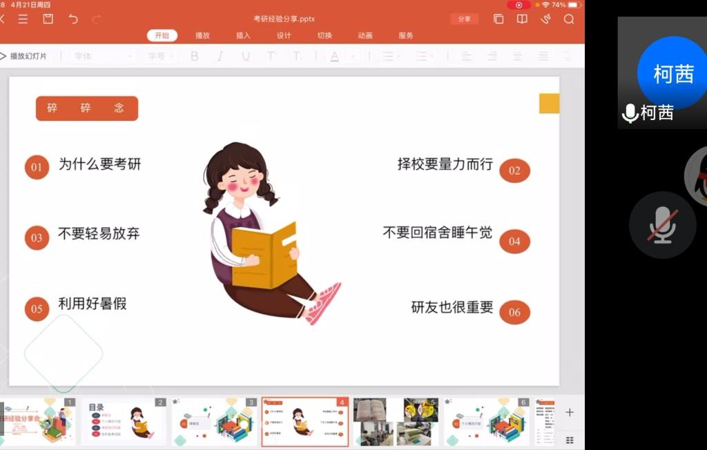 为深入总结分层分类教学经验,做实做细学生服务,全面提升人才培养质量,4月21日下午英语专业在W117举行考研经验分享会。此次分享由信阳师范学院拟录取研究生18级英语1班的柯茜同学以线上的方式进行。我院2019级意向选择学科英语考研方向的31名学生、英语专业教研室主任王灵焱老师及英语教育类课程负责人韩笑老师参加分享会。