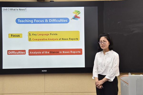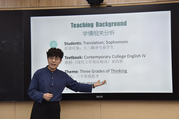 此次比赛面向我院所有中青年教师,经过初赛和复赛的激烈角逐,最终共有6位教师成功晋级决赛。决赛中要求每位教师使用10分钟时间完成一个课程章节说课,并完成现场答辩。各位参赛教师纷纷使出浑身解数,展示各自的教学设计和技能水平。参赛教师根据“成效导向”的课程设计理念和多元评价概念,普遍把“教评合一”活动分为课前、课中和课后三个环节,有助于调动学生参与语言学习和知识构建的积极性,体现了语言目标与育人目标的有机融合。