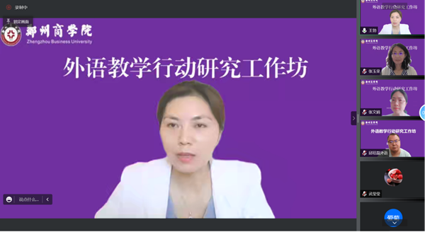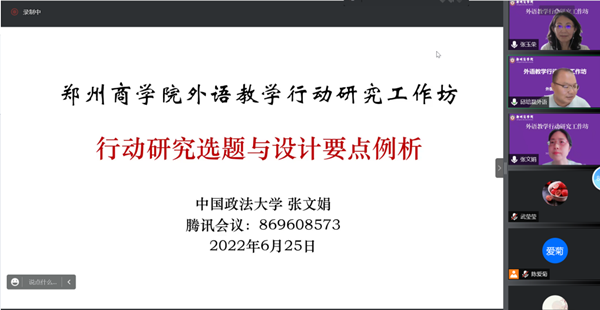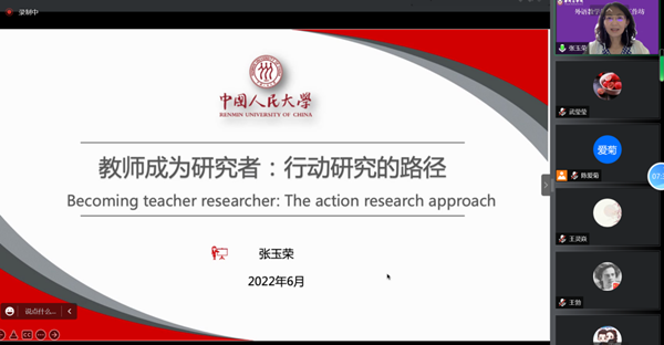此外,中国政法大学外国语学院张文娟教授,以“行动研究选题及设计要点例析”为题,为大家重点讲述了行动研究的选题及依据,并通过具体题目的举例,分析选题设计及其合理性。同时采用实时线上互动的形式与大家沟通交流,为大家答疑解惑,大家均表示受益匪浅。