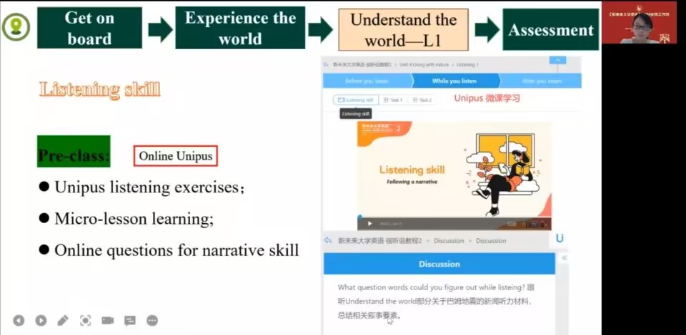 我院大学英语教研室教师宣菡静、尤宇以《转变教师角色培养多元能力》为题,以beat365使用《新未来大学英语》视听说教材进行线上线下混合式教学案例为依托,聚焦教材中的多元文化呈现和多元能力培养,围绕产出任务设计教学思路,结合混合式教学步骤分享了课程设计经验,并获得了《新未来大学英语》课程团队优创奖的荣誉称号。