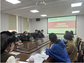 10月27日下午,外国语学院在W209会议室召开2022年10月份党政联席会议,集体学习和讨论习近平总书记在中国共产党第二十次全国代表大会上的报告。外国语学院党委书记王克志、院长邱培磊、副院长赵保成,各教研室主任及全体辅导员老师出席会议。