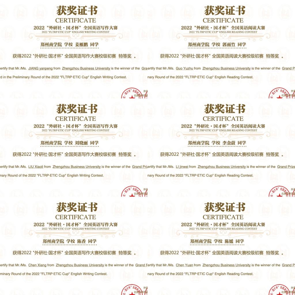 在2022年“外研社·国才杯”全国英语写作大赛校园初赛中共有67人获奖。其中,我院学子陈香、姜雁鹏、刘晓丽勇夺特等奖,常译文、孙郭婷、马文等人荣获一等奖。