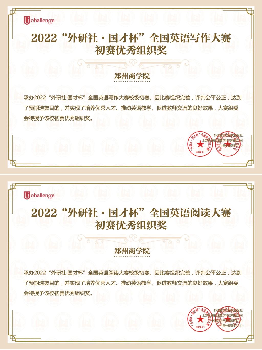 2022“外研社·国才杯”全国英语写作与阅读大赛初赛优秀组织奖证书