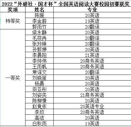 在2022年“外研社·国才杯”全国英语阅读大赛校园初赛中共有103人获奖。其中,我院陈媛、李金蔚、郭雨竹勇夺特等奖,梁永静、毛筱冉、张玲琳等人荣获一等奖。