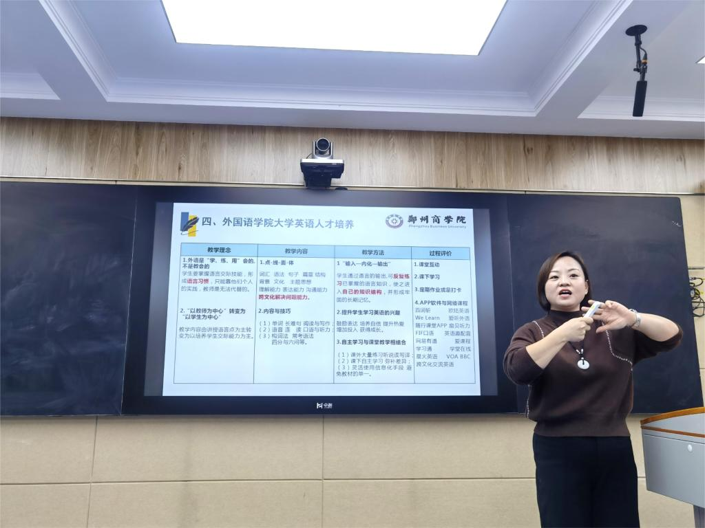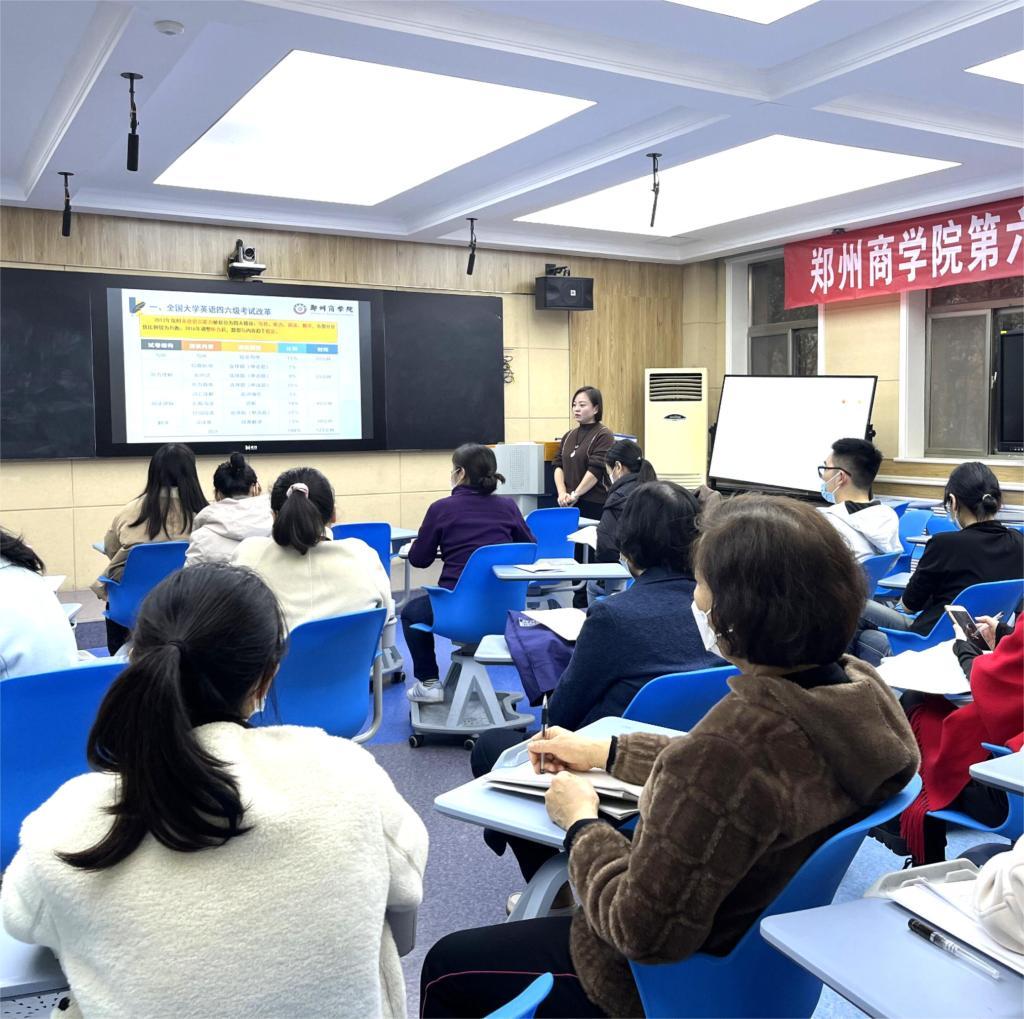 11月22日下午,外国语学院大学英语教研室在外语楼104智慧教室组织召开大学英语教学改革研讨会。本次研讨会由大学英语课程组组长贠翁翁老师主持,教研室三十余名教师全部参会。会上教研室吕丽静老师以《依托大学英语四六级考试改革 提升学生英语综合应用能力》为主题进行教研分享。