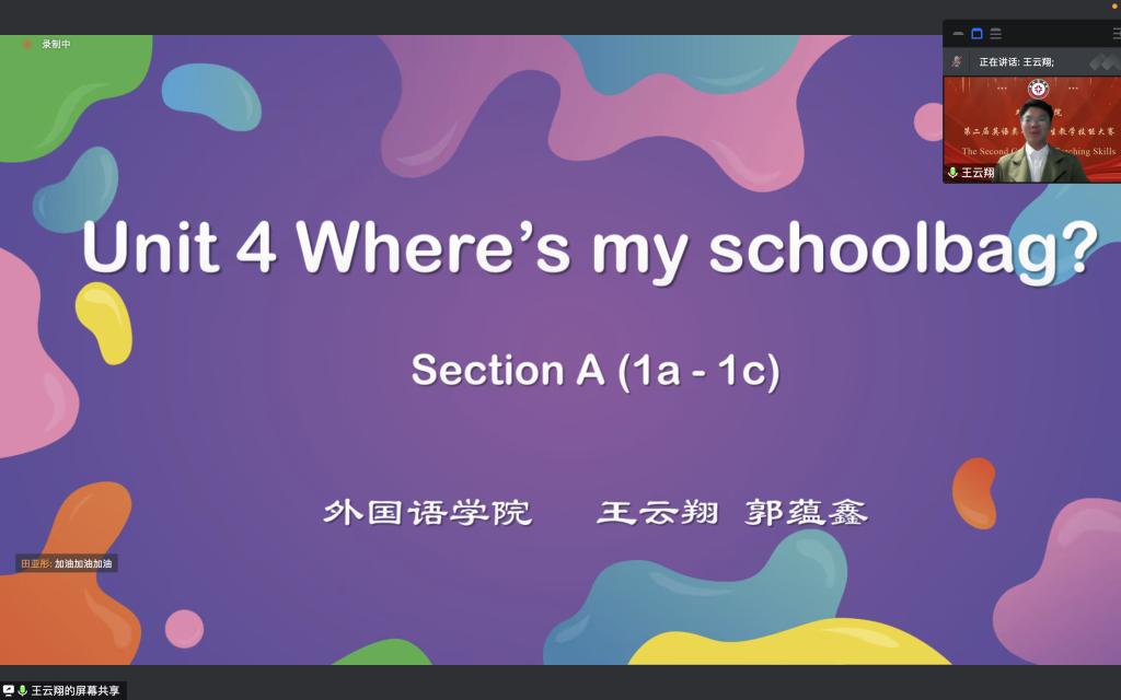 本次比赛内容依据现行英语教材任选单元,参赛团队需进行相应的教学设计、课件制作、模拟上课等一系列准备,然后录制并提交参赛视频给比赛组委会。经过各班学生的积极准备及前期班级选拔推荐(视频初赛)、评委审核(视频复赛)等系列环节,最终产生了6支优胜团队选手进入总决赛。