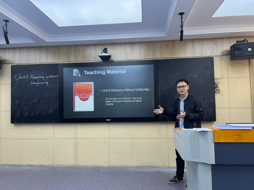 本次比赛主要由“课程说课”和“现场答辩”两部分组成,共计10分钟,选手按抽签顺序依次进行展示。共11位选手进入复赛,评委依照百分制形式现场为选手打分,依据评分标准选出前6名进入决赛。比赛材料为统一教学材料《理解当代中国》读写教程第八单元Harmony Without Uniformity,参赛教师需进行相应的教学设计、课件制作,进行7-10分钟说课并回答评委问题。