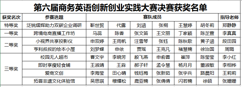 大赛共有八支赛队参与各个奖项的角逐,选手围绕创新创业、企业调研进行选题,通过线上或线下调研、数据收集、市场分析、方案拟定等多种方式完成,最终以英文报告形式呈现。比赛期间,参赛选手以访谈、话剧、直播模拟等方式创新表达、自信展示、默契配合。在评委提问环节,他们自信大方,逻辑清晰,展现了商务英语专业学生的风采,呈现出一场精英交锋的创新思维盛宴,赢得了评委和在场观众的阵阵掌声。评委们秉持公平公正的原则,对参赛团队的精彩表现进行了评分,比赛结果如下: