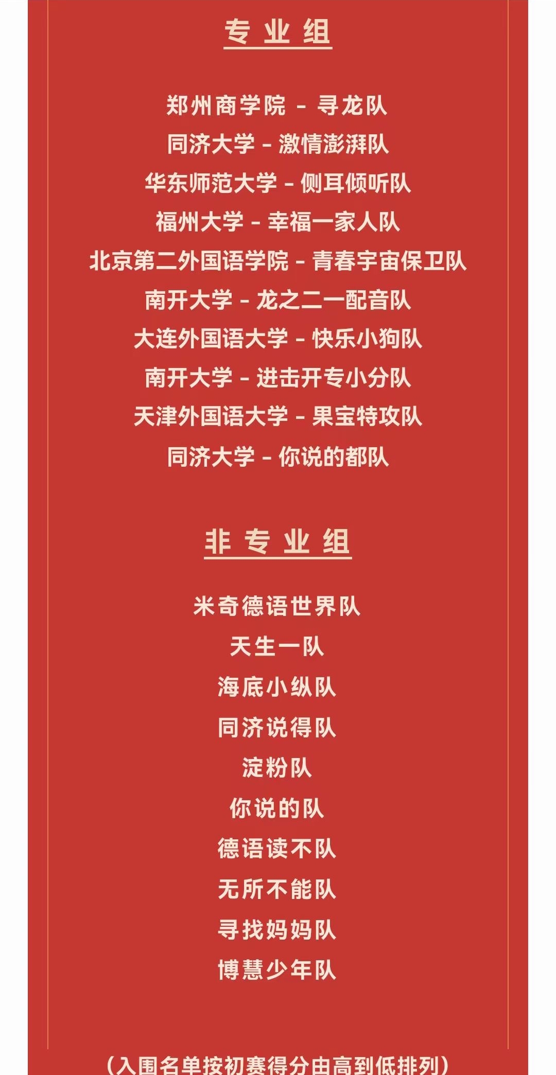 该比赛旨在促进中德文化交流,提高学生的德语语言水平和配音能力。参赛选手包括中国人民大学、同济大学、南开大学、北京第二外国语大学等超过30所高校的德语专业学生,需要在规定时间内完成配音并上传初赛作品。要求语音语调正确贴切,表达流畅,感情饱满,能够真实再现原作品的艺术创作效果,把握剧情和剧中人物的性格和情感。经过严格的评委团打分,最终决出分数排名前十的队伍进入决赛。