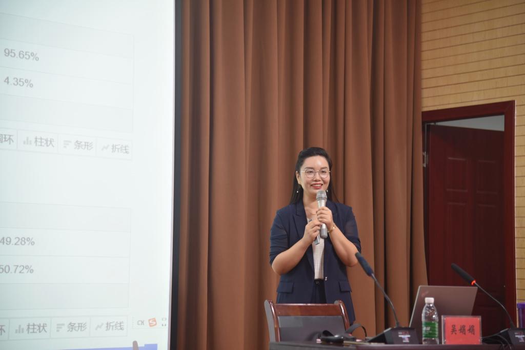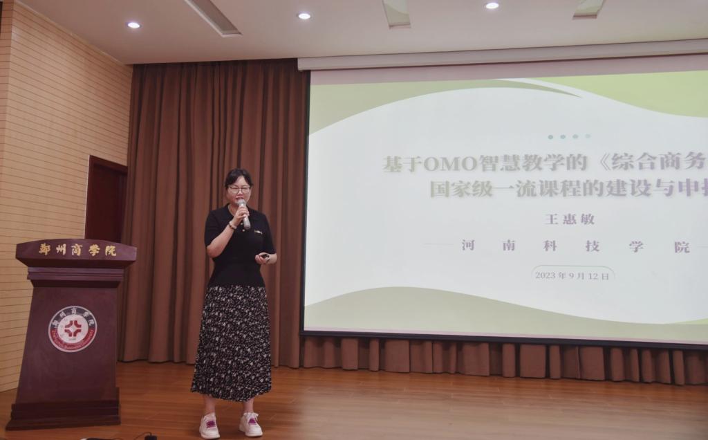 王惠敏老师以“基于OMO智慧教学的《综合商务英语》国家级一流课程的建设与申报”为题作了报告。王老师以“课程建设要素”为切入点,分别从教师基础、学生基础、课程基础三个方面进行分析,分析得出《综合商务英语》课程改革要以商务活动为主题的场景模拟和案例学习等交际任务组织单元教学,进行OMO(Online-Merge-Offline)智慧教学,达到线上线下的深度融合,促进学生的深度学习,同时也要有针对性地引导学生在课前、课中、课后进行有效学习,她的讲解深入浅出,使全体教师对《综合商务英语》课程改革有了更加深刻的了解,不时赢得在座老师们的阵阵掌声。