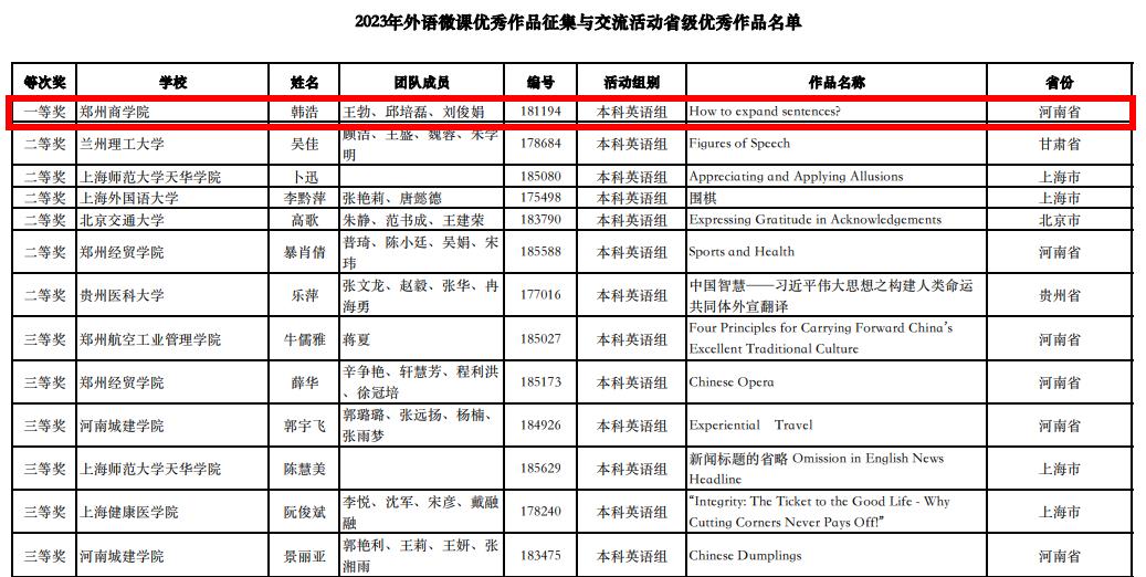 8月31日,从2023年外语微课优秀作品征集与交流活动组委会传来捷报,我院英语专业韩浩老师负责的英文写作教学团队提交的微课作品荣获河南省一等奖,并获得进入全国赛的资格。