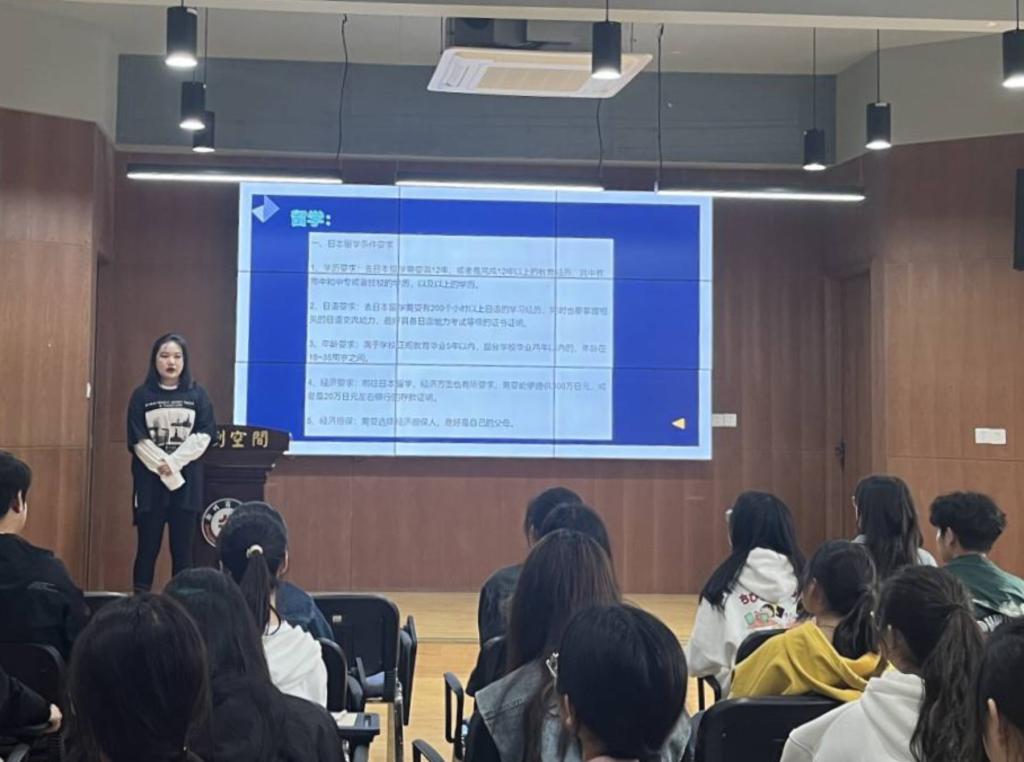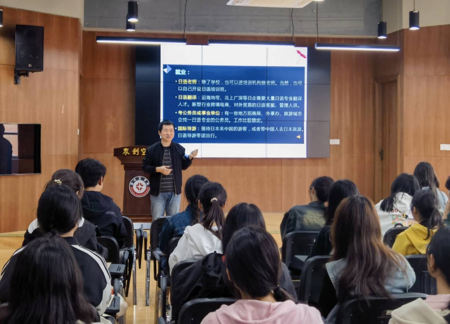 然后,钟浩老师从日语专业人才培养目标及课程设置、实践教学、技能竞赛、考研就业等方面,详细地向同学们介绍了专业的基本情况和要求,引导学生尽快了解专业、明确奋斗目标。张洋老师则从留学、考证等方面进行了详细讲解,督促学生制定短期计划及长期计划,除日语专业学习外还要求同学们根据自己的兴趣有目的性去学习其他方面的专业知识。