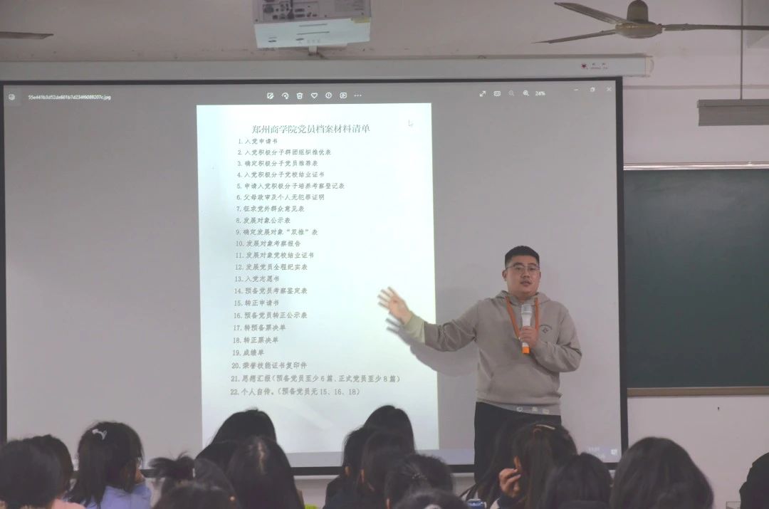 丁震霆老师围绕发展党员的流程和标准两个方面,重点从申请入党、入党积极分子的确定和培养、发展对象的确定和考察、预备党员的接收、预备党员的教育考察和转正等方面详细介绍了发展党员的工作流程和要求。同时鼓励同学们要做“爱国、励志、求真、力行”的表率,坚持奋斗、积极向党组织靠拢,要认真学习党章党规党史,坚定理想信念,为“组织上入党”、“思想上入党”打下坚实的基础。