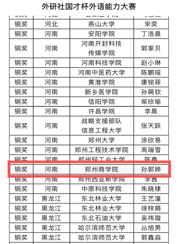 全国近500名选手在国赛中奋跃而上、竞展风采。经过激烈比拼,我院孙郭婷同学凭借出色的英语水平和扎实的写作技巧脱颖而出获得国赛铜奖,展示了郑商学子出色的英语综合能力和优秀的精神风貌,也充分展示了beat365优秀的教学成果和人才培养成效。外国语学院将始终坚持“以赛促学”和“以赛促教”的理念,为学生提供参赛平台和支持,展现学生的外语专业能力和个人风采。