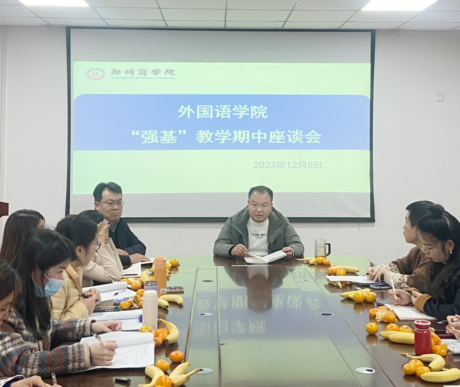 座谈会由副院长赵保成主持,他首先带领基础语言课程教师回顾了“强基”教学计划的意义与重要性,强调了“综合英语”“基础日语”“基础德语”等课程是外语专业学生基础与根本,是外语专业学生未来升学与高质量就业的重要支撑作用,要求各基础课程组务必坚持按照“强基”教学计划,认真扎实开展教学与作业检查。接下来,他要求各教师汇报本学期“强基”教学实践,通过汇报,审视自己对学生学业负责程度,展示学生作业检查质量与次数,反思自己在学生学习习惯养成方面的引领作用。
