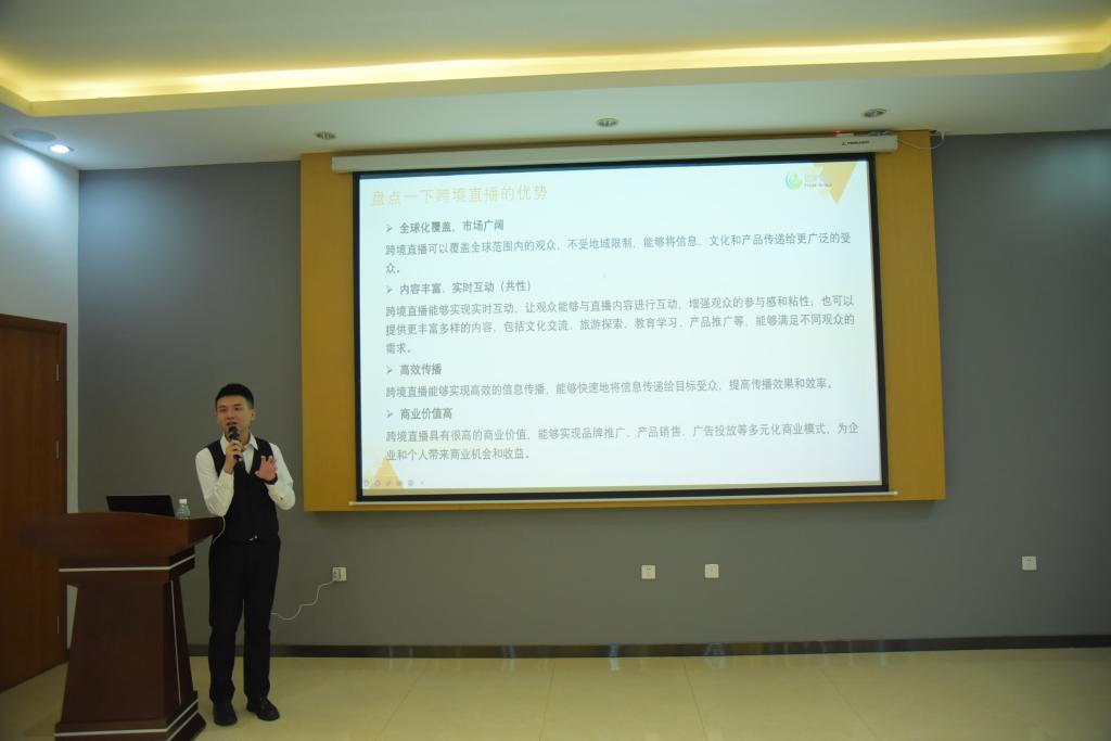 随后,主讲人聂威老师全面深入地从跨境直播、行业资讯、自我评估及未来发展等四个方面展开“跨境启新篇,直播引新潮”为主题的跨境直播专题讲座。聂老师首先讲述了直播行业的发展历程,引导学生们思考了跨境电商与传统外贸的区别;他从行业角度出发,分享了跨境电商直播的相关数据,鼓励学生们提高数据分析能力和复盘能力;然后,聂老师从自我评估方面对学生们提出了四点展望,希望学生们从听说读写四方面提升自己、增强核心竞争力;最后,聂老师从个人未来发展角度给同学们提出了建议,指引了学生未来的职业发展方向。