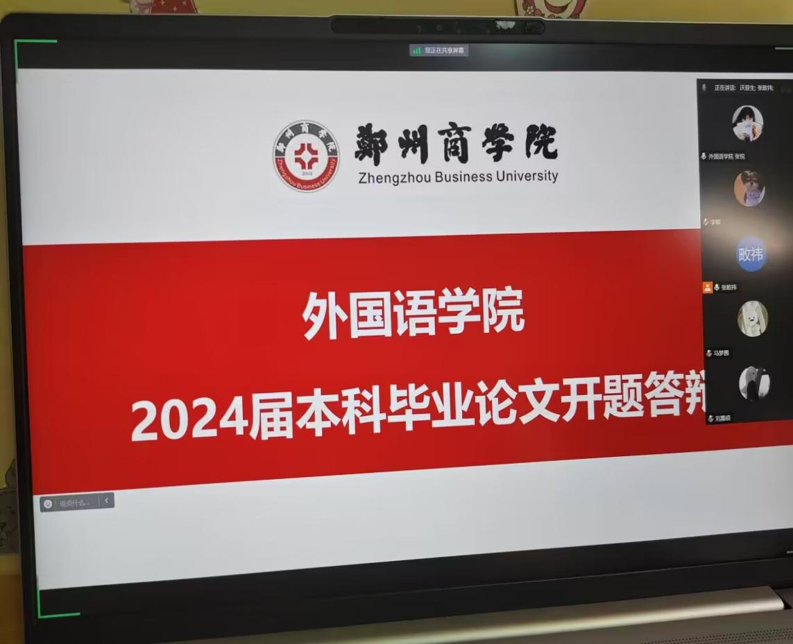 根据学校2024届毕业论文(设计)工作通知精神和时间节点,外国语学院2024届本科毕业生论文指导工作稳步有序开展。为进一步规范毕业论文选题、开题等环节的管理,严把论文关,提高论文质量,外国语学院于1月2日-1月8日顺利完成了2024届毕业论文线上开题答辩工作。
