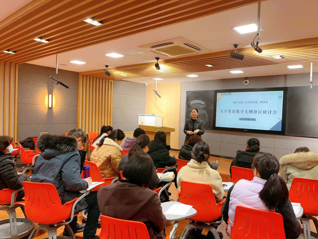 接着,各课程组组长对各自负责的大学英语课程大纲修订优化方案进行了分享。各位组长深入浅出地指出大学英语课程改革应更加细化教学目标、加强课程考核要求及评分标准与课程目标的关联、优化课程过程性考核方式、细化课程评分标准;教师在教学实践中应该重视学生的实际学习成果和能力的培养;通过设定明确的学习目标、基于学生的学习结果进行评价、提供及时的反馈和改进机会,从而更好地指导和改进教学。