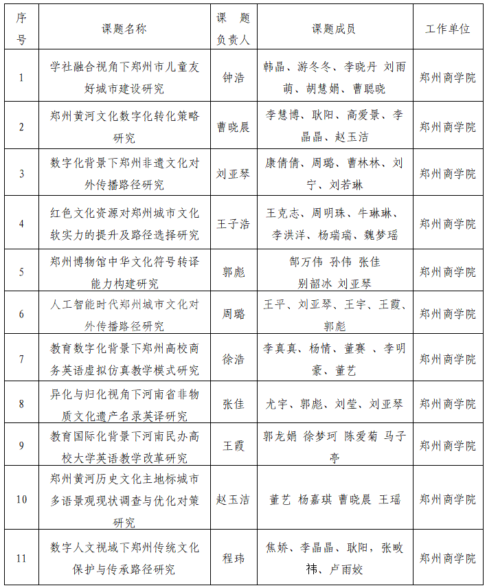 根据《郑州市社科联2024年度调研类课题申报通知》要求,深入学习贯彻党的二十大精神暨省、市全会精神,以及中央、省、市经济工作会议精神,更好地做好社科调研课题研究工作,为郑州市经济社会高质量发展提供理论支撑和智力服务,我院积极组织申报工作,共申报32项,经学院评审委员会评审决定,现就2024年度郑州市社科调研课题申报拟推荐名单(11人)公布如下: