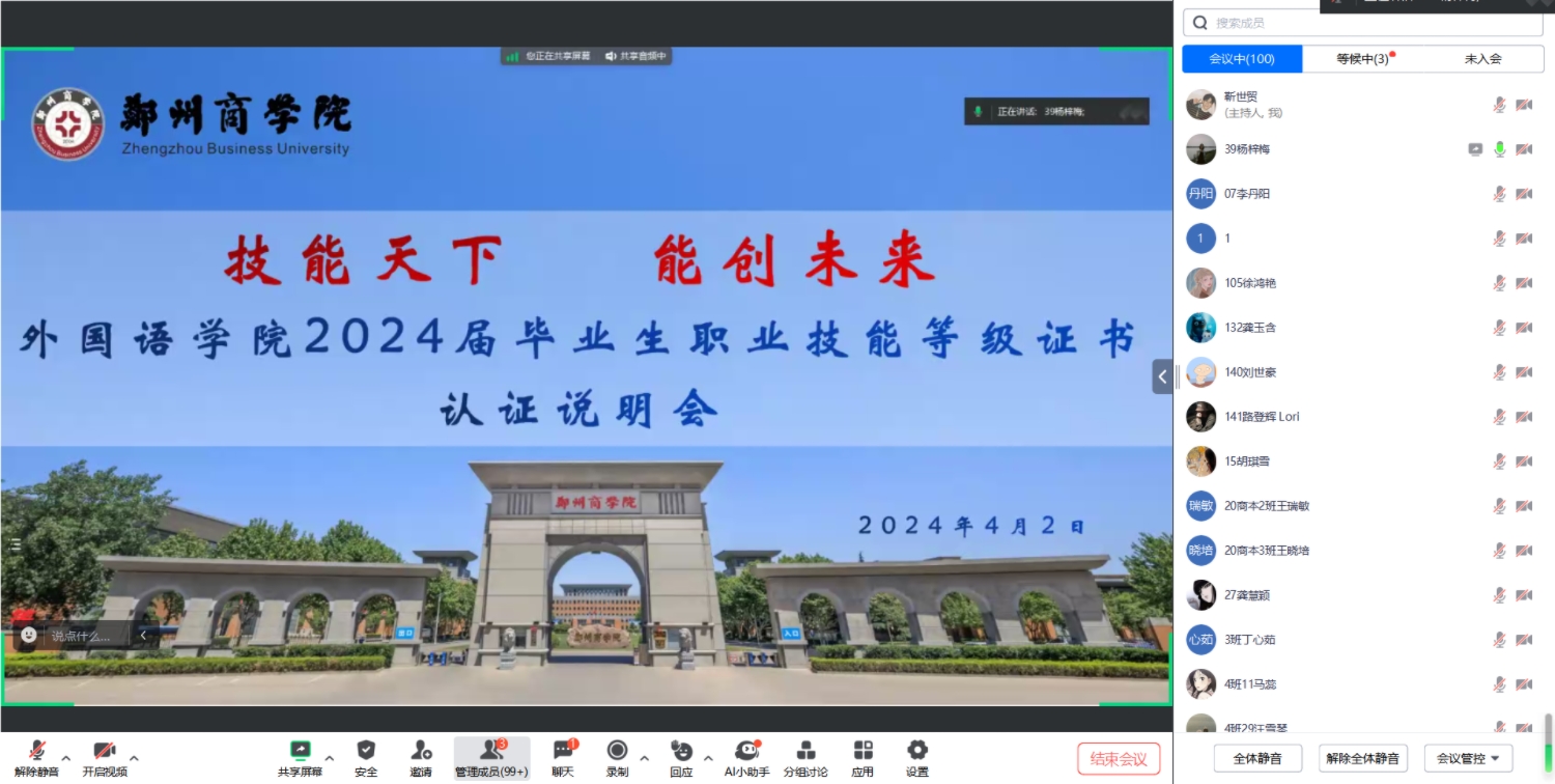 根据校2023-2024学年第二学期“人人持证、技能河南”建设工作推进会的工作安排,我院迅速行动,全力投入到评价取证工作中。依据校已认定的职业工种,结合我院实际取证情况,4月2日,我院召开了2024届毕业生职业技能等级证书认证说明会,我院2020级商务英语本科专业、2021级商务英语专科专业全体学生参加了此次说明会。