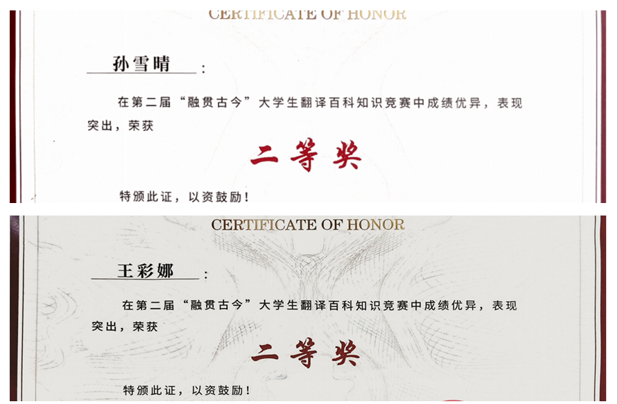 在本次比赛中,beat365的学子们以卓越的表现展现了自己的实力和才华,为beat365赢得了一系列的荣誉。beat365共有252名同学参赛,132位同学荣获奖项。其中,22翻译1班的王彩娜和22翻译2班的孙雪晴获得全国二等奖,21英语专业的聂夕雅同学获得全国三等奖。另外,还有129名同学获得优秀奖。