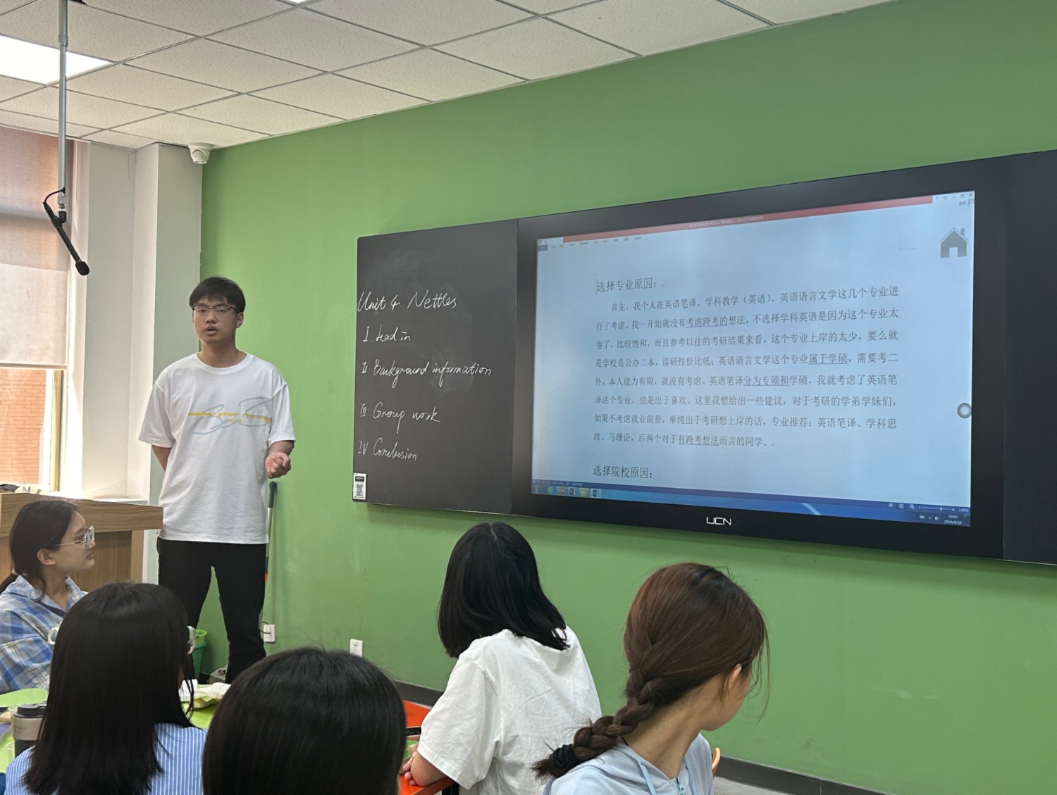会议伊始,成功考取英语笔译专业的赵亚军同学、赵雯琪同学、郭玉婷同学分别向大家介绍她们的备考思路。亚军同学从择校、备考科目和心态调整方面给出了建议。他特别强调了日常坚持单词背诵的必要性,分享了自己背单词的技巧和方法。同时,他提醒大家研究生考试的择校一定要尽早开始,要在暑假到来之前确定好自己的目标院校并准备好所需资料,最好在七月之前完成第一轮备考学习。雯琪同学除了择校策略的分享之外,还讲述她在复试过程中的应对技巧和经验。玉婷同学则详细介绍了如何通过参加各种专业类的比赛来提高自己的语言能力和应试技巧。