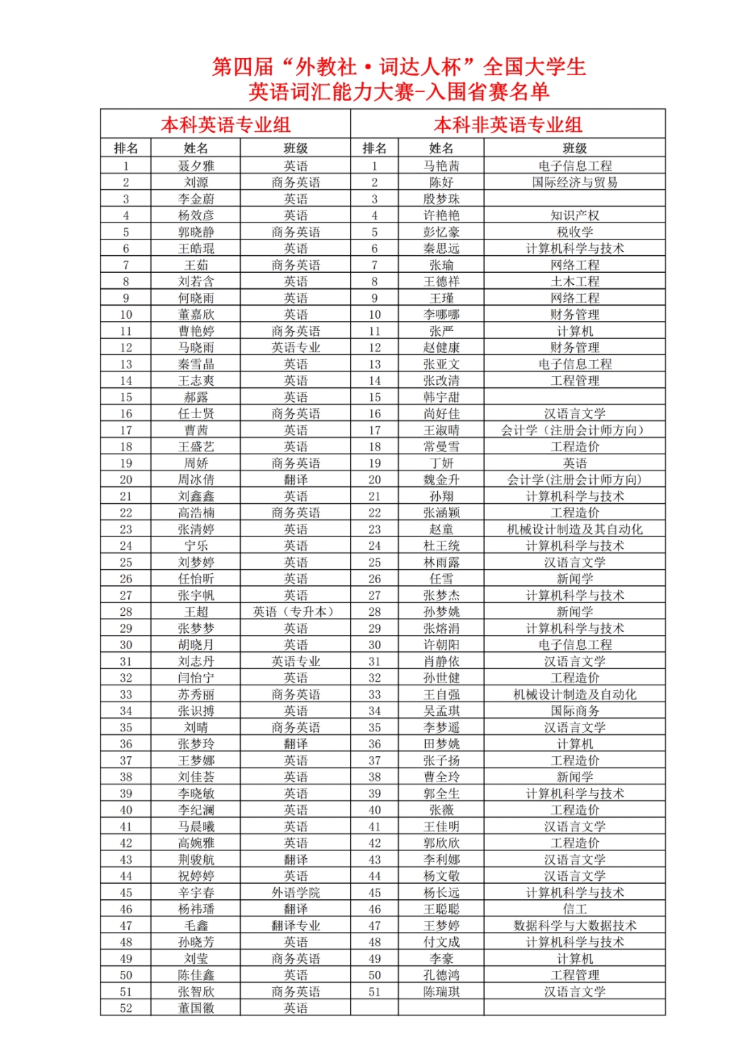 经过校赛晋级省赛同学。本科非英语类专业组52名,本科英语类专业组51名,共计103名同学。