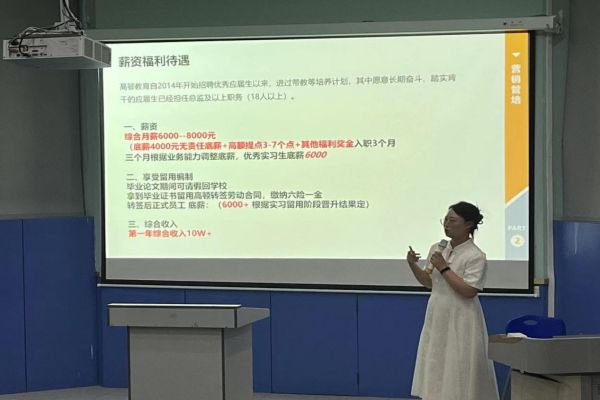 宣讲会伊始,上海高顿人力资源负责人利用企业宣讲片向毕业生们介绍:高顿教育成立于2006年,是一家以科技为驱动,以财经教育为核心,以大学教育、学历教育、职业教育为重点发展方向,集教育培训、教育服务、教育科技与产品研发于一体的综合性国际职业教育集团。公司规模7000人。接下来,通过PPT展示的方式,向同学们介绍了本次招聘岗位,表示本次招聘课程规划师(销售岗):2025届实习生刚来是4000无责底薪+提成+奖金,免费提供住宿。每3个月一次调薪机会,优秀实习生6000元底薪+提成+奖金。