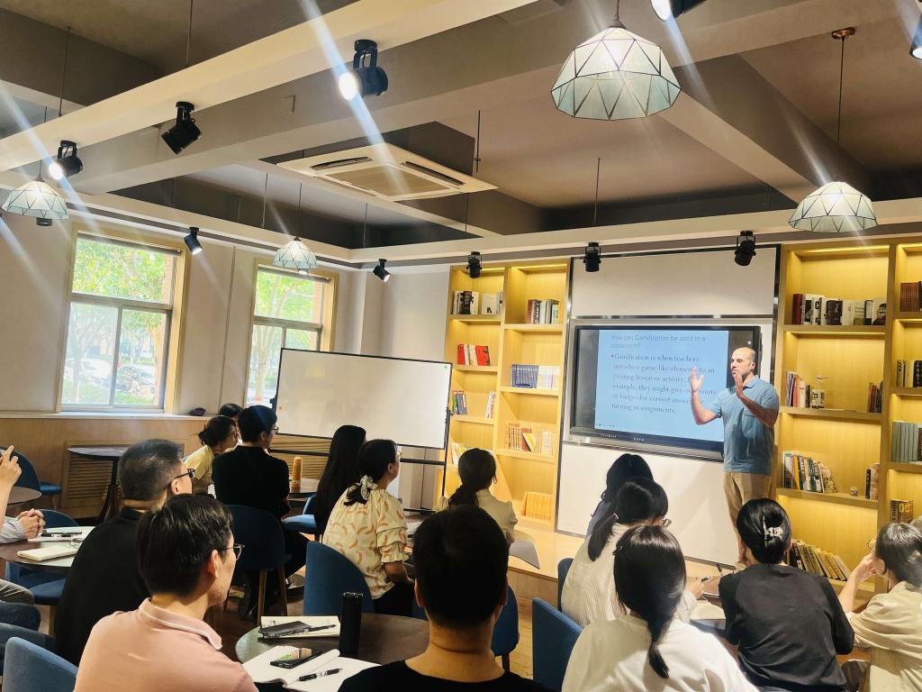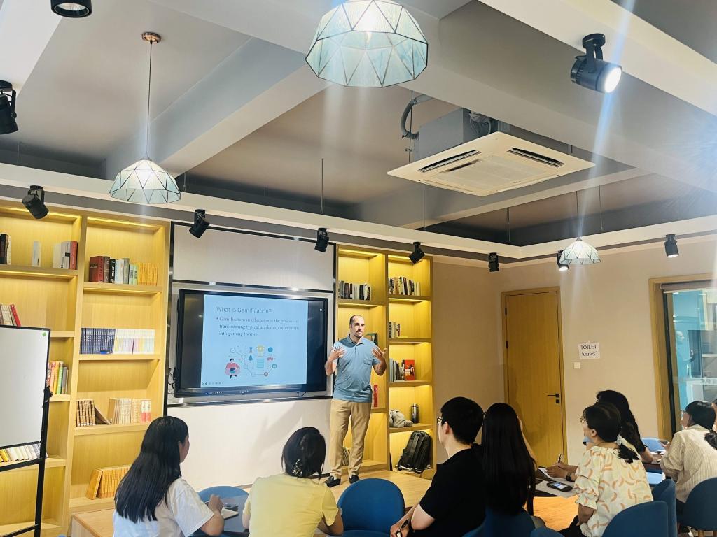 沙龙由外教教研室主任高爱景主持,美籍教师Talal主讲。首先,Talal首先提出“我们能否在课堂中使用游戏化的教学方法”这一问题,激发与会教师的探讨兴趣。接着,Talal对“Gamification”进行简单介绍,游戏化是指教师在现有课程或活动中引入类似游戏的元素,例如,教师为正确回答问题或者及时上交作业的学生发放积分。其次,Talal列举游戏化教学的五大好处并举例分析。最后,与会教师围绕本次沙龙的主题进行研讨交流,各自分享教学经验和实践案例。这种讨论的方式不仅加深了老师对Gamification教学方法的理解,而且进一步探讨了如何将游戏化教学方法应用在商务英语课堂中。
